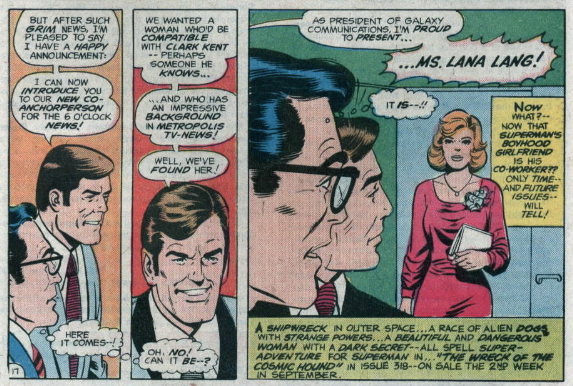 Marty Pasko said he had trouble writing stories for Superman’s supporting characters. Too often, he wanted to do something and was told he couldn’t because someone else had plans. No one was using Lana Lang, so in 1977, Superman 317, Morgan Edge hired Lana to co-anchor with Clark on WGBS.